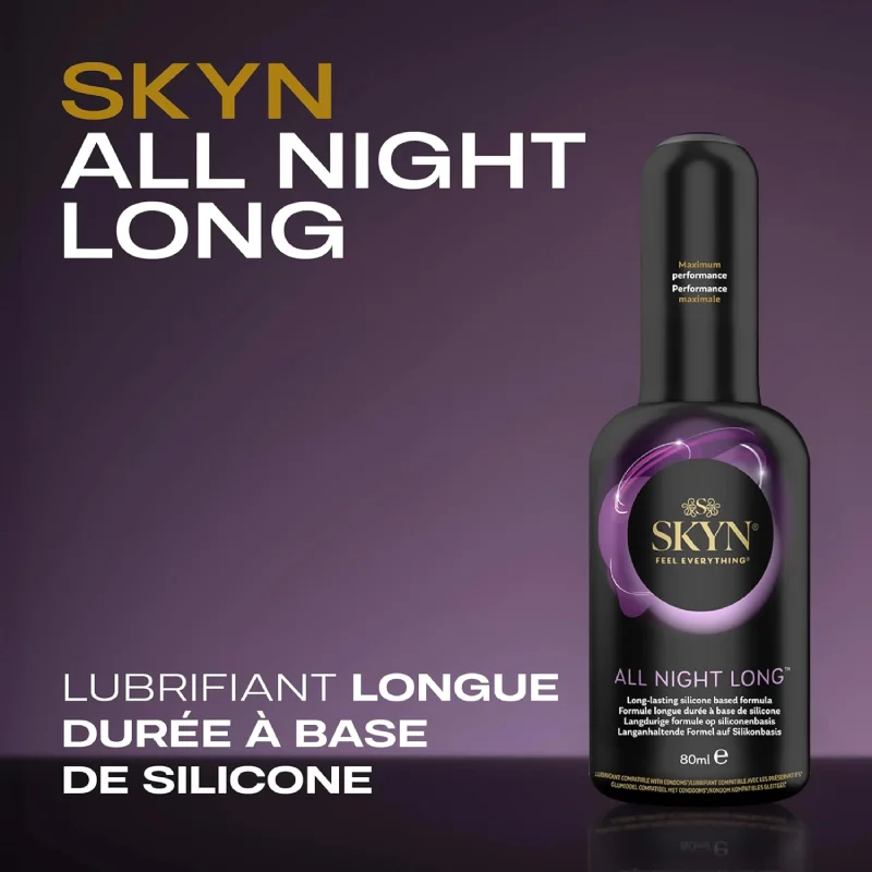Un lubrifiant silicone est souvent choisi pour sa tenue plus longue et sa texture conçue pour durer. Il peut être particulièrement apprécié lorsque l’on souhaite une glisse plus continue et un confort prolongé. Pour les utilisateurs à la recherche d’un lubrifiant intime longue durée compatible avec les préservatifs, SKYN All Night Long 80 mL constitue une option simple, efficace et facile à utiliser.